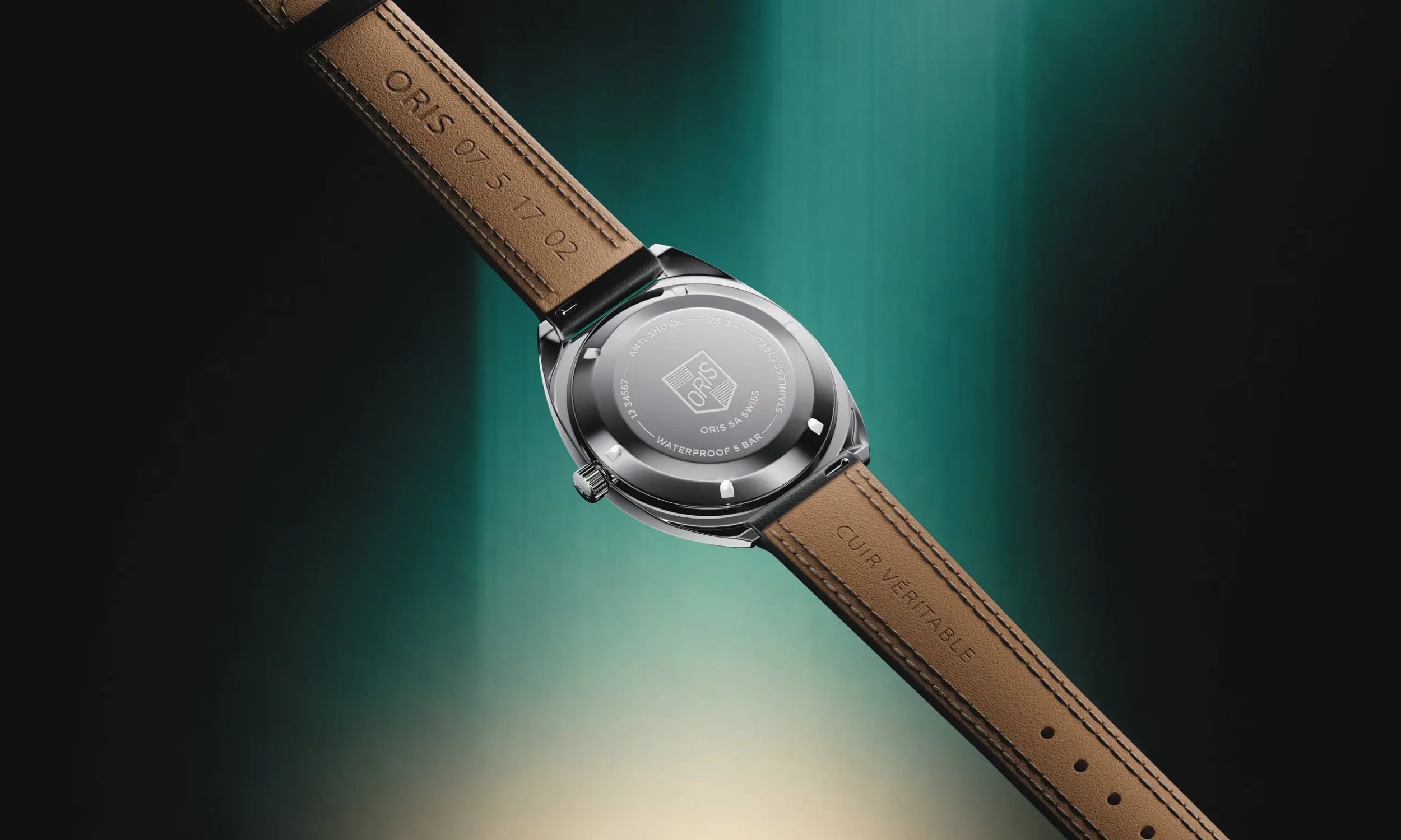 Ein besonders schönes Detail für Kenner der Markenhistorie findet sich auf dem verschraubten Gehäuseboden aus Edelstahl. Dort prangt eine Gravur des ikonischen Oris-Schildes aus den 1960er-Jahren. Dieses Symbol steht sinnbildlich für die Standhaftigkeit des Unternehmens, das sich wie ein „Stehaufmännchen“ durch die verschiedenen Krisen der Uhrenindustrie gekämpft hat.