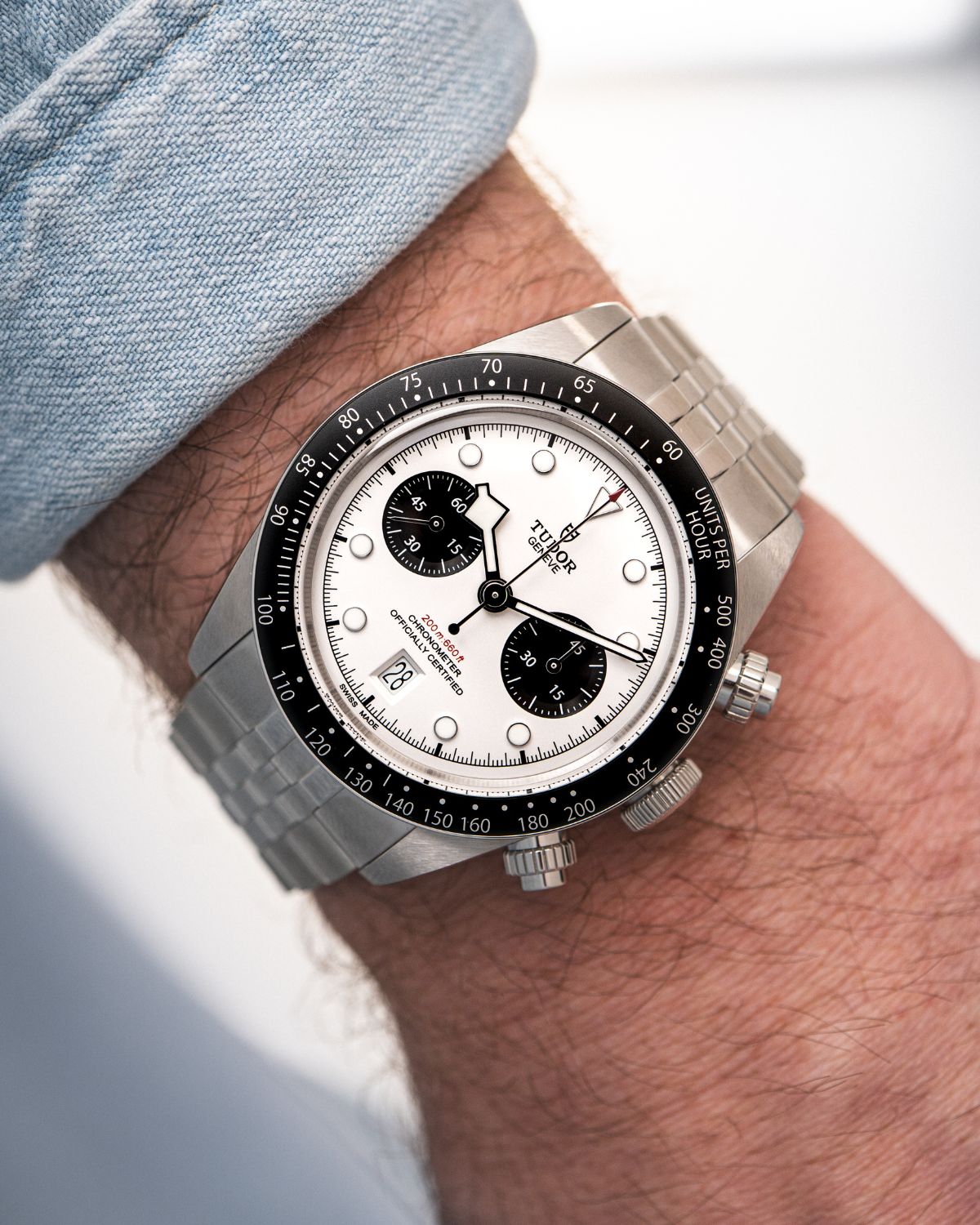Die TUDOR Black Bay Chrono vereint auf geschickte Weise die DNA klassischer Taucheruhren mit der funktionalen Ästhetik eines modernen Rennsport-Chronographen. Das opalfarbene, gewölbte Zifferblatt bildet einen harten Kontrast zu den schwarzen Totalisatoren und sorgt so für die typische Panda-Optik. Das 41-mm-Edelstahlgehäuse ist bis zu einer Tiefe von 200 Metern wasserdicht, was das Modell zu einem äußerst robusten und vielseitigen Allrounder macht.
