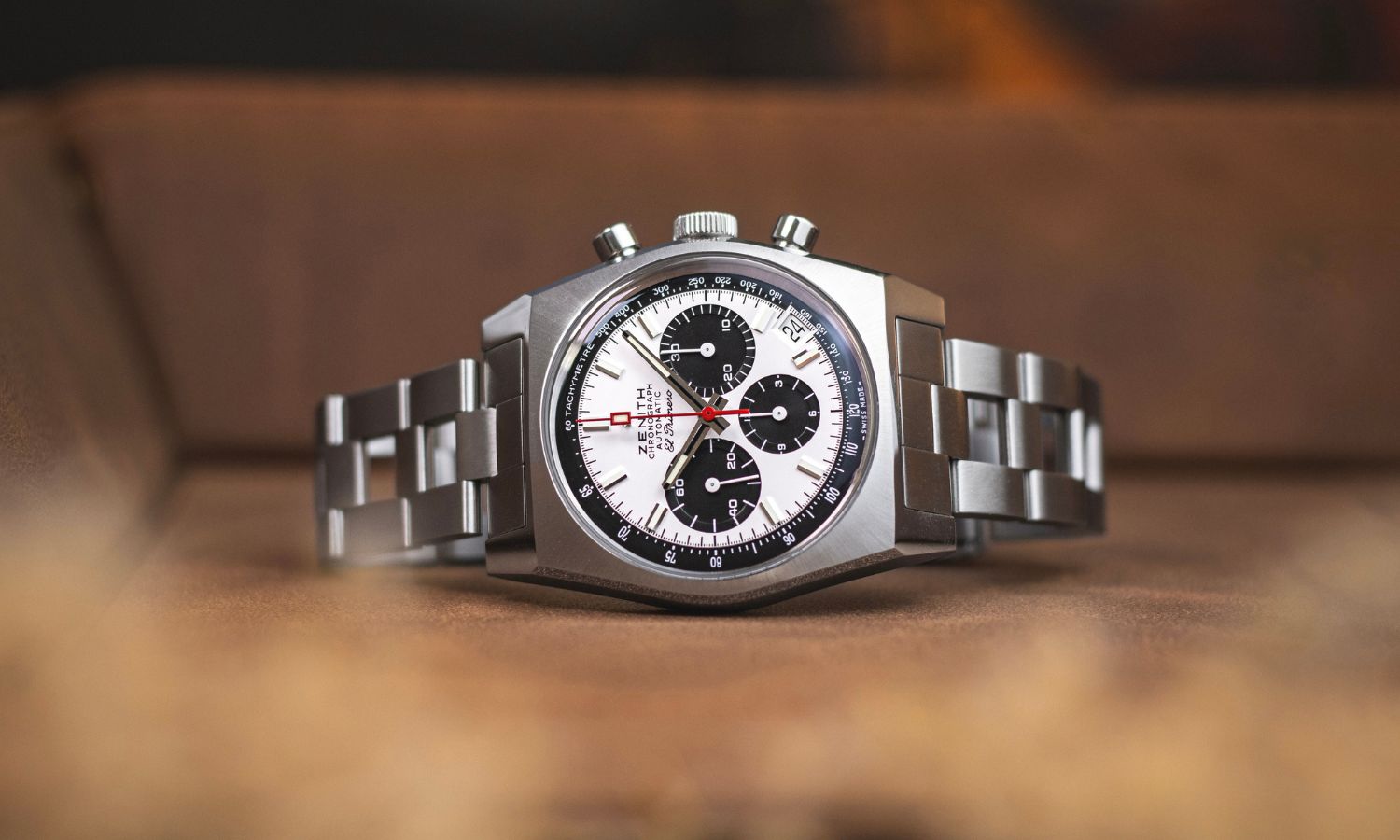 Zenith feiert mit der Chronomaster Revival A384 das Erbe des legendären Jahres 1969, als das erste El Primero Werk die Uhrenwelt grundlegend revolutionierte. Das authentische 37-mm-Stahlgehäuse in charakteristischer Tonneau-Form bewahrt den Charme des Originals und bietet ein klassisches Panda-Layout mit Tachymeterskala. Das Datum ist dabei dezent zwischen 4 und 5 Uhr platziert, was die Symmetrie des historischen Designs bewahrt.