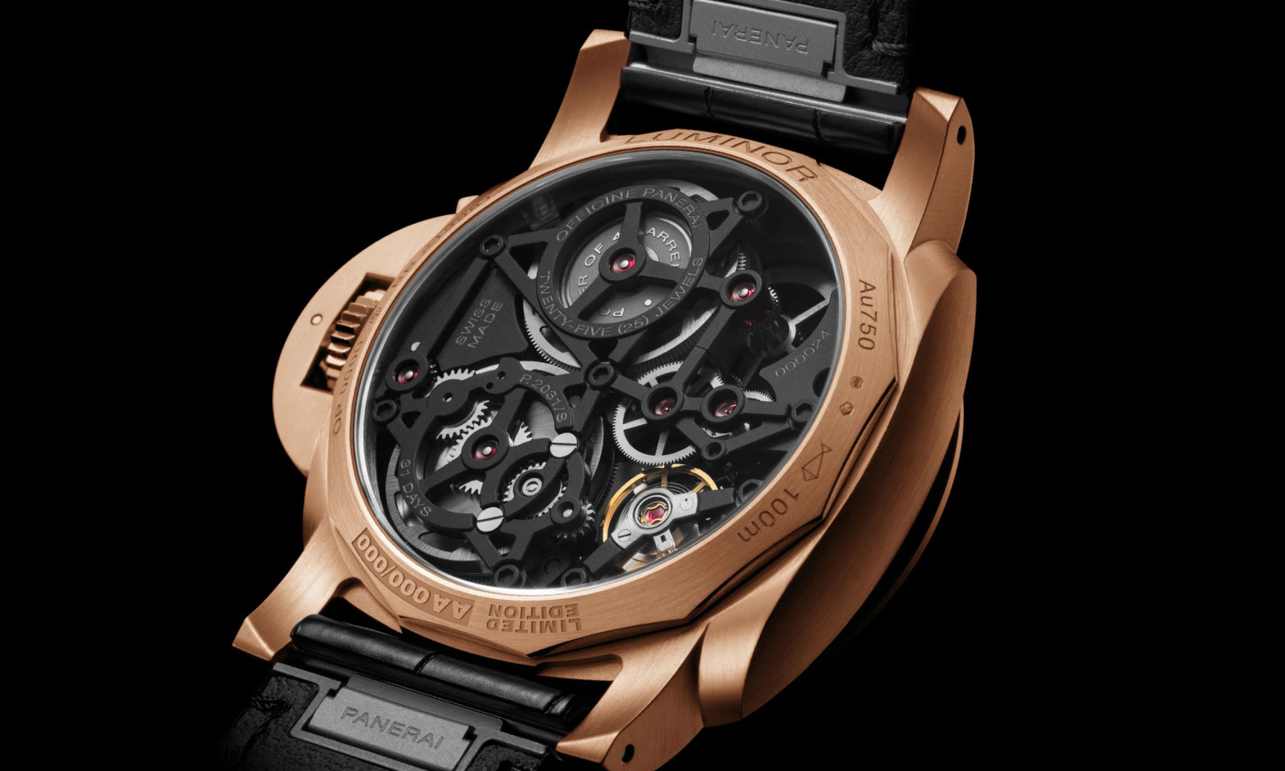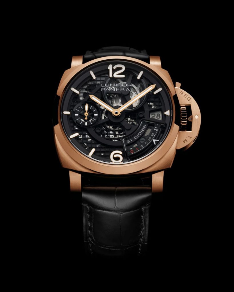 Die Luminor 31 Giorni PAM01631 bricht alle Rekorde. Nach sieben Jahren Entwicklung präsentiert Panerai ein skelettiertes Handaufzugswerk, das Kaliber P.2031/S, das eine Gangreserve von sagenhaften 31 Tagen bietet. Vier Federhäuser und insgesamt 3,3 Meter Zugfeder sorgen für diese Autonomie. Das Gehäuse aus gebürstetem Goldtech™ (44 mm) verleiht dieser technischen Meisterleistung einen luxuriösen Rahmen.
