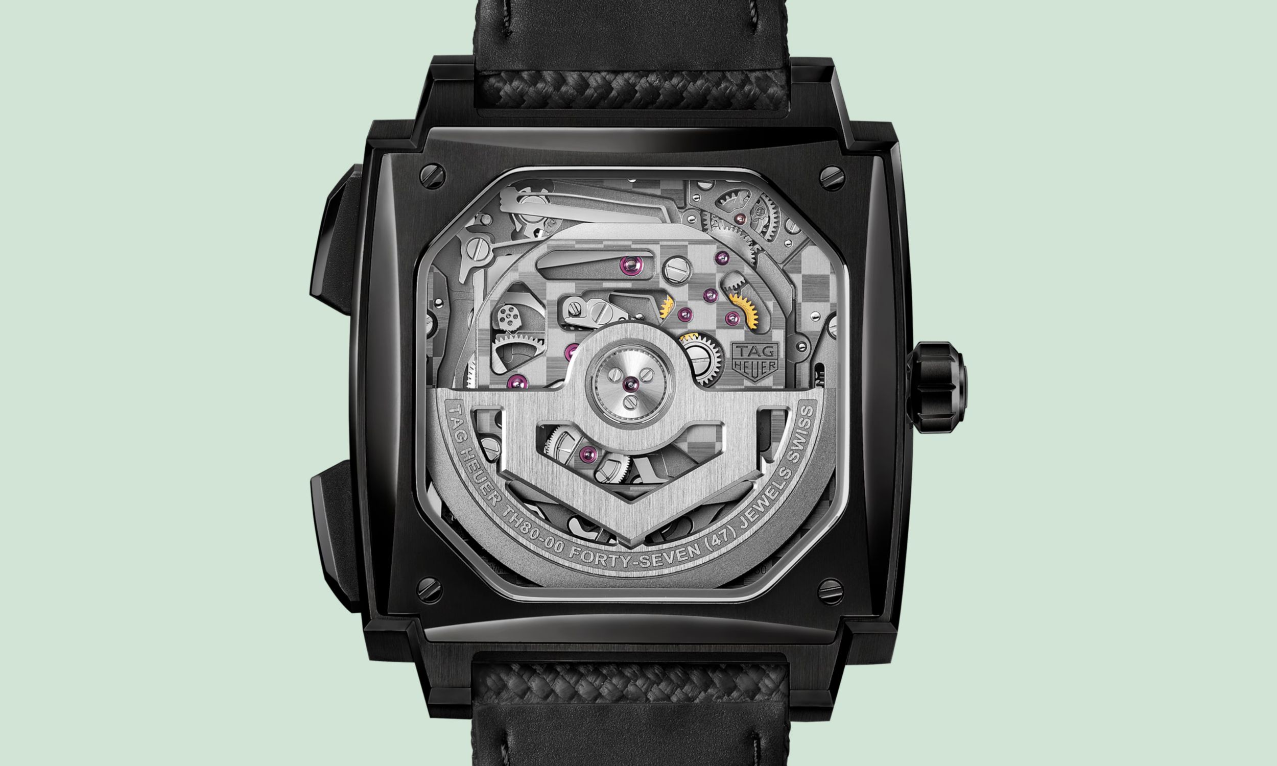 Das im Monaco Evergraph verbaute TH80-00 Manufakturwerk ist eine gänzlich neue Entwicklung, die speziell auf die Geometrie des quadratischen Gehäuses zugeschnitten wurde. Es handelt sich um ein automatisches Chronographenwerk, das die Grenzen des Machbaren verschiebt.